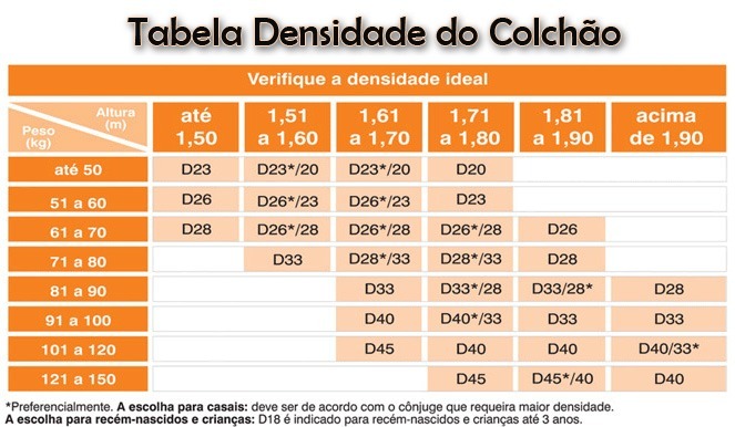 Isso não quer dizer, porém, que um colchão D33 suporta apenas uma pessoa de 33 quilos. Lembre-se de que essa quantidade se refere apenas a um metro cúbico de espuma. A verdade é que um produto com essa densidade pode ser usado por um usuário com peso que varia de 71 a 120, dependendo de sua altura.