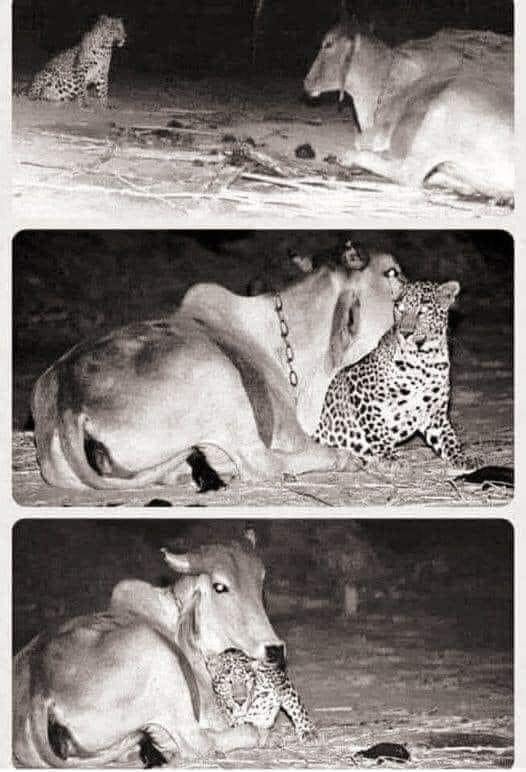 Desde então, a onça pensa que a vaca é sua mãe. E ela vem todos os dias à noite para vê-la.