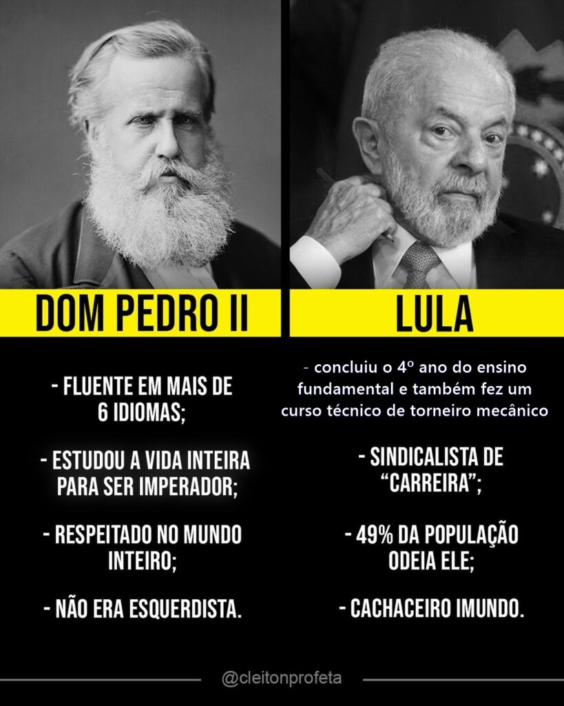 De um lado, Dom Pedro II — um estadista preparado desde a infância, fluente em vários idiomas, respeitado internacionalmente e dedicado à ciência, cultura e ao progresso do país.