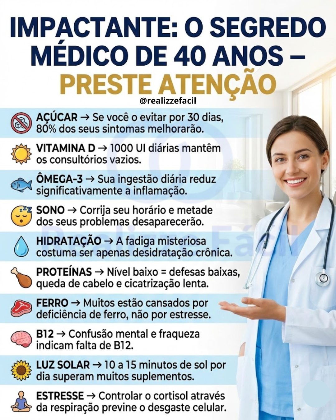 A imagem viral com o título “IMPACTANTE: O SEGREDO MÉDICO DE 40 ANOS” traz uma série de afirmações diretas e sugestivas sobre hábitos simples que poderiam transformar nossa saúde. Embora apresentada de forma sensacionalista, a mensagem central nos convida a uma reflexão profunda: será que negligenciamos o óbvio na busca por soluções complexas para nossos males?
