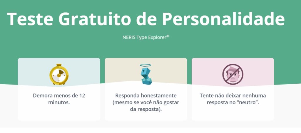Demora menos de 12 minutos. Responda honestamente (mesmo se você não gostar da resposta). Tente não deixar nenhuma resposta no “neutro”. Acesse o link: https://www.16personalities.com